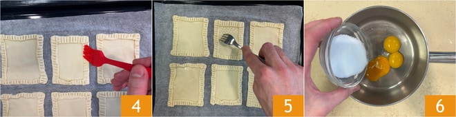 Pincelad todos los bordes con la clara de huevo 4 y agujeread la base con el tenedor 5. Cocinad los hojaldres en horno precalentado con ventilación a 200° durante unos 8 minutos. Mientras tanto, preparad la crema pastelera: colocad las yemas y el azúcar en un cazo 6.