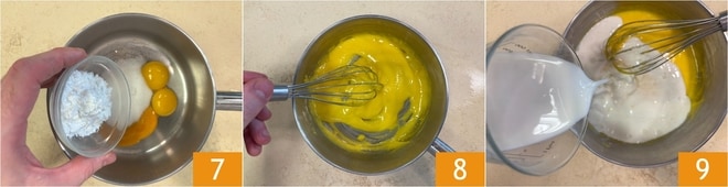 Añadid la maicena tamizada 7 y mezclad con una varilla de mano para integrar los ingredientes 8. Verted la leche en un hilo mientras mezcláis con la varilla 9.