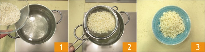 Para preparar el hosomaki vegetariano, comenzad con la cocción del arroz originario. Enjuagadlo bajo agua fría corriente y hervidlo en agua salada durante 9 minutos. 1. Escurrid el arroz 2 y condimentadlo con el vinagre de arroz, luego dejadlo enfriar a temperatura ambiente 3.