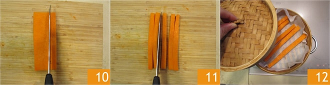 Mientras tanto, cortad la calabaza de manera que se obtengan 4 rectángulos de 21 cm de largo y con un ancho y alto de aproximadamente 1 cm 10 11. Poned los rectángulos de calabaza en la misma vaporera y dejadlos cocinar por 7 minutos 12.