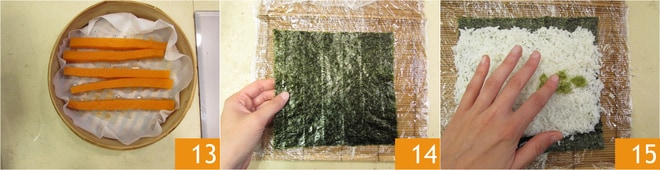 Una vez cocida, dejad enfriar la calabaza 13. En este punto, colocad el alga sobre la esterilla 14 para sushi y distribuid el arroz encima, asegurándoos de llegar hasta el borde del lado corto y dejando aproximadamente 1 cm de espacio vacío en ambos lados largos, aplastándolo bien con las manos. En el centro, untad con el dedo una línea de wasabi 15.