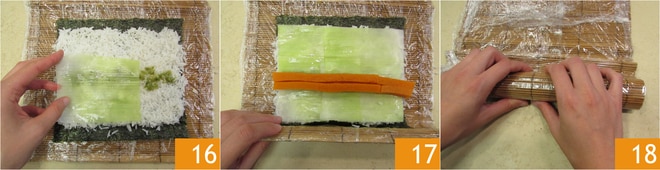 Colocad en toda la superficie del arroz 4 hojas de puerro 16 y posteriormente colocad en el centro 2 rectángulos de calabaza 17. Ahora enrollad vuestro hosomaki comenzando desde abajo, apretad bien con las manos hasta que el rollo esté bien compacto 18.