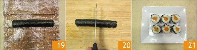 En este punto 19 transferidlo a una tabla de cortar y cortadlo primero por la mitad y luego en 6 piezas 20. Vuestro hosomaki vegetariano está listo para ser servido, si lo deseáis, con salsa de soja 21.