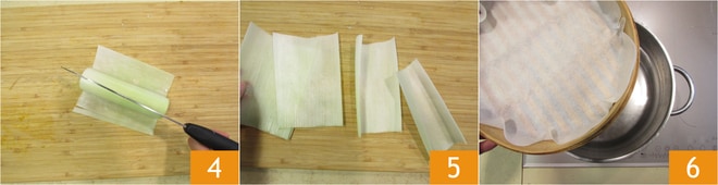 Cortad el puerro con el cuchillo en el sentido longitudinal 4 y desgajadlo 5. Preparad una vaporera con cesta revestida de papel de horno 6.