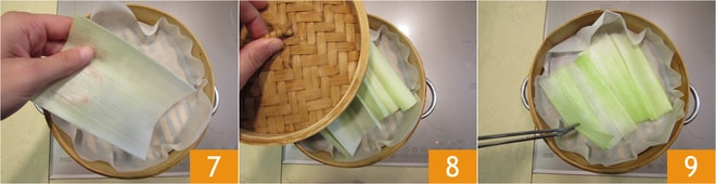Colocad aquí las hojas del puerro 7 y cocinad por 5 minutos con tapa 8. Una vez cocidos 9, transferidlos a un plato para que se enfríen.