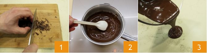 Para preparar el huevo de Pascua de chocolate negro, comienza con el templado del chocolate: pica el chocolate negro al 70% 1 y derrítelo a baño maría (es preferible que el agua de la cacerola apenas toque el fondo del cuenco donde has colocado el chocolate) 2; cuando el chocolate haya alcanzado una temperatura de 54° (mide con el termómetro de cocina), seca el fondo de la cacerola (mantén el agua caliente en la cacerola) y vierte 2/3 sobre una losa de mármol situada en una superficie de trabajo (la losa de mármol sirve para enfriar el chocolate más rápido y alcanzar la temperatura ideal) 3;