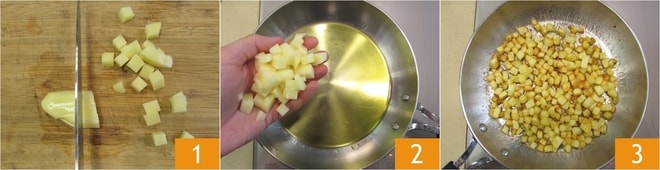 Para preparar los huevos a la flamenca, primero pela las patatas y córtalas en cubos de aproximadamente medio centímetro 1. Calienta el aceite para cubrir el fondo de una sartén, añade las patatas 2 y sofríelas a fuego alto hasta que estén doradas 3.