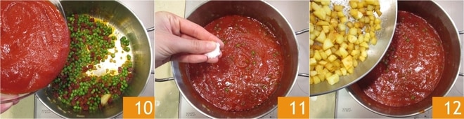 Vierte también el puré de tomate 10, sal 11, pimienta y cocina a fuego medio durante unos 30 minutos, tapado. Pasado este tiempo, añade las patatas 12.
