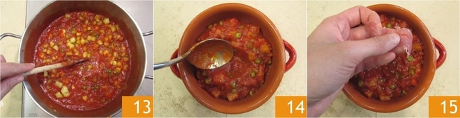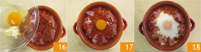 Mezcla bien 13 y apaga el fuego. A este punto, distribuye la salsa en 4 cocottes 14 y añade el jamón serrano, desmenuzándolo con las manos 15.