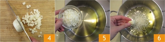 Mientras tanto, limpia y pica la cebolla 4, luego sofríela con un poco de aceite en otra sartén 5 junto con el diente de ajo 6.