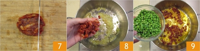 Mientras tanto, corta el chorizo en rodajas y redúcelo a cubitos 7. Cuando la cebolla esté transparente, añade el chorizo 8 y sofríe durante otros 5 minutos, luego agrega los guisantes 9.