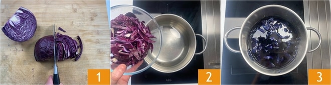Para preparar los huevos coloreados rellenos, lo primero que tenéis que hacer son los purés. Cortad la col 1, sumergidla en agua hirviendo con sal 2 y dejadla cocer durante unos 30 minutos 3.