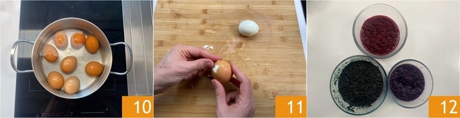 A continuación, pasad a los huevos. Colocadlos en una cacerola y cubridlos con agua fría 10. Encended el fuego y contad 9 minutos desde el primer hervor. Mantened la llama baja para no romper los huevos, luego escurridlos con cuidado y enfriadlos en agua fría. Romped la cáscara en la pequeña cámara de aire que se encuentra en la base y peladlos con mucho cuidado 11. Procurad no romper los huevos, es importante que estén lisos. Recoged los 3 purés.