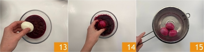 Sumergid los huevos en su interior 13, de manera que queden completamente cubiertos por el puré. Cubrid con film transparente 14 y guardad en el frigorífico durante toda la noche. Luego, retirad los huevos del puré 14 y enjuagadlos rápidamente 15.