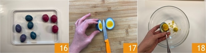 A medida que los vais sacando, colocad los huevos en una bandeja 16, sin acercarlos demasiado. Tened en cuenta que aún tenderán a soltar color. Dividid los huevos a la mitad 17, sacad la yema con una cuchara y trasladadlas a un bol 18.