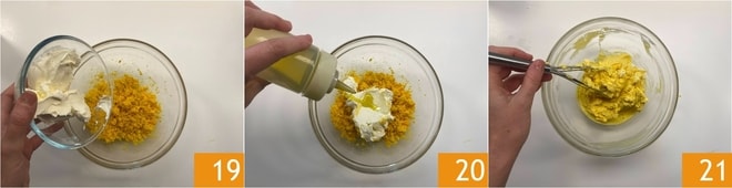 Salad, pimentad y añadid el queso cremoso 19. Verted el aceite 20 y mezclad bien con un batidor 21.