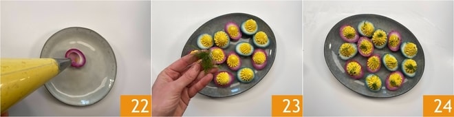 Transferid la mezcla a una manga pastelera con boquilla estriada y rellenad vuestros huevos coloreados 22. Decorad con el hinojo 23 y añadid otro poco de sal, pimienta y un chorrito de aceite 24.