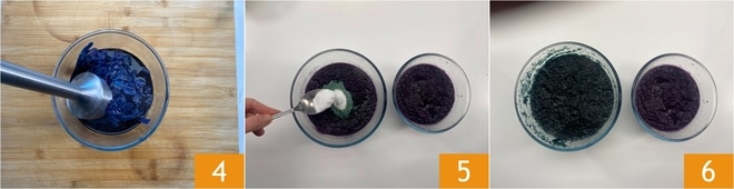 Luego, escurridla y trituradla con una batidora de mano para obtener un puré 4. Dividid el puré en 2 boles y en uno de ellos añadid un poco de bicarbonato para hacer el color más azul 5. Mezclad bien 6.