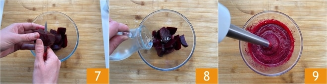 Para realizar el color rosa, cortad la remolacha en cubos en un bol 7; añadid un poco de agua 8 y triturad con una batidora de mano para obtener un puré 9. Si es necesario, añadid un poco más de agua.