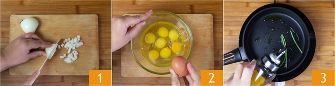 Para preparar los huevos revueltos con tomate, lo primero que hay que hacer es picar finamente la cebolla 1 y cascar los huevos dentro de un bol 2. En una sartén poned tallos de perejil, verted el aceite 3 y calentad durante 2 minutos.