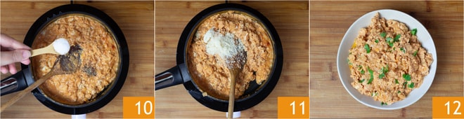 Ajustad de sal y pimienta 10. Finalmente, añadid el queso parmesano rallado 11 y removéd durante algunos minutos. Servid y completad con perejil fresco picado. Los huevos revueltos con tomate están listos para ser disfrutados 12.