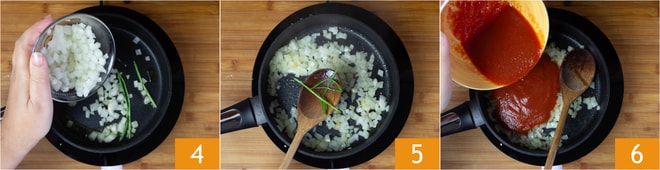 Añadid la cebolla 4 y sofreídla a fuego vivo durante 3 minutos. Retirad los tallos de perejil 5 y añadid el tomate triturado 6. Cocinad a fuego lento durante 10-12 minutos.