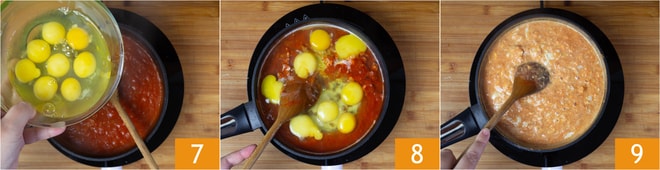 Añadid los huevos a la sartén 7 y mezclad para romper las yemas 8. Cocinad durante unos 10 minutos, removiendo de vez en cuando 9.