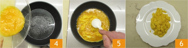 Para preparar los huevos revueltos, primero rompe los huevos en un bol, añade pimienta 1 y sal al gusto 2, luego bate con un batidor de mano: la mezcla de yemas y claras no debe quedar completamente homogénea 3.