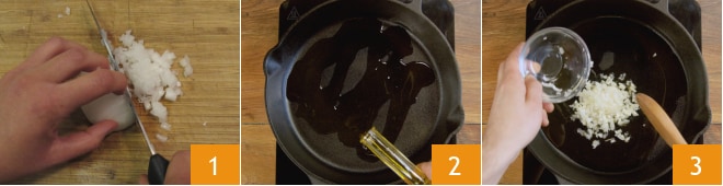 Para preparar huevos y guisantes, primero limpia y pica finamente la cebolla 1. Vierte un chorrito de aceite en una cacerola 2 y añade la cebolla 3.