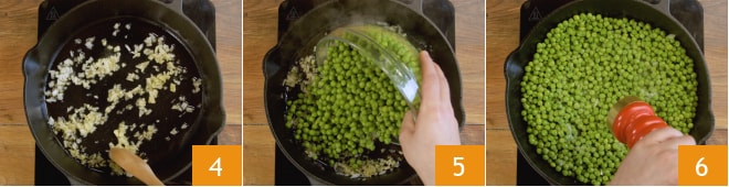 Deja que la cebolla se ablande a fuego lento durante unos minutos 4, removiendo de vez en cuando, luego añade los guisantes 5 y ajusta de sal y pimienta 6. Cocina durante unos 10 minutos siempre a fuego lento, removiendo de vez en cuando.