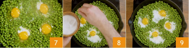 En este punto, rompe cuidadosamente los huevos en la sartén con los guisantes, asegurándote de que queden intactos 7. Cocina hasta alcanzar el grado de cocción deseado: si prefieres la yema líquida, bastarán 5 minutos, sin tapa, hasta que la clara se vuelva blanca. Si prefieres que la yema quede dura, entonces cocina durante unos 10 minutos con la tapa. Finalmente, sazona con una pizca más de sal 8 y pimienta al gusto: ¡sirve tus huevos y guisantes bien calientes 9!