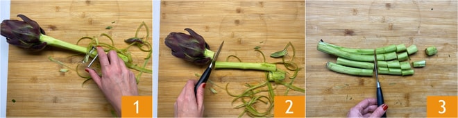 Para preparar el hummus con tallos de alcachofa empieza con la Cómo limpiar las alcachofas. Utilizando un pelador de patatas, retira la parte más externa, que resultaría amarga 1. Si aún está presente la alcachofa, córtala 2 y resérvala para tus recetas. Corta los tallos de la alcachofa en trozos 3.