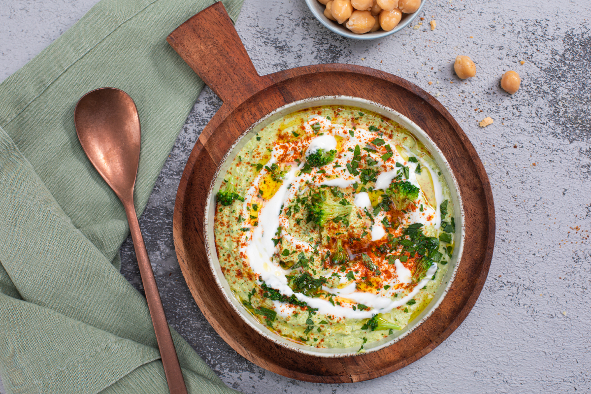 ¿Un aperitivo a la vista? ¡Recibe a tus amigos con una deliciosa receta vegetariana: el hummus de brócoli especiado y yogur! Una variante del clásico Hummus a base de garbanzos y tahina enriquecida con verdura de temporada, yogur con miel y un toque de pimentón. El zumo de lima, además, aporta un toque exótico a esta salsa cremosa y sabrosa. La preparación es fácil y rápida, ideal para hacer incluso en el último momento… ¡basta acompañar el hummus de brócoli especiado y yogur con triangulitos de pita o piadina, o simplemente con crostini, y el aperitivo está listo!