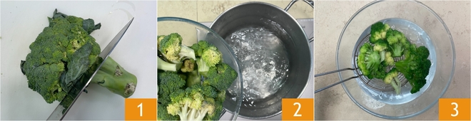 Para realizar el hummus de brócoli especiado y yogur, primero limpia el brócoli: necesitarás obtener aproximadamente 300 g de floretes 1. Hiérvelos en agua con sal durante unos 5 minutos 2, luego escúrrelos en un bol con agua fría y hielo 3; de esta manera detenerás la cocción y el color permanecerá brillante.