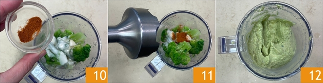 Finalmente, saboriza con el pimentón 10 y mezcla 11 hasta obtener una consistencia suave y homogénea 12.