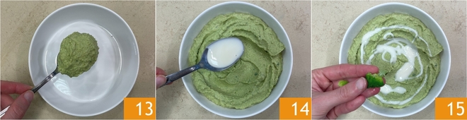 Transfiere la mezcla a un bol para servir 13 y decora con el yogur restante 14 y los floretes reservados 15.