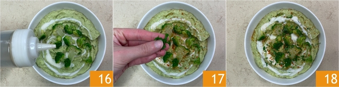 Completa con un hilo de aceite 16, una pizca de pimentón y algunas hojas de perejil 17. ¡Tu hummus de brócoli especiado y yogur está listo para ser servido 18!