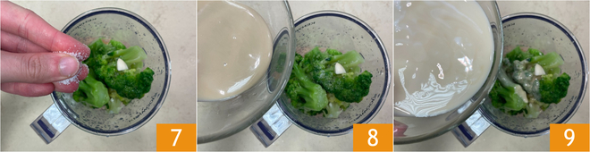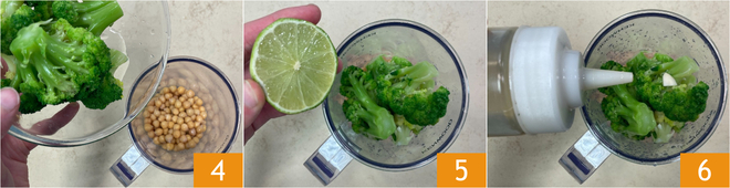 Vierte los garbanzos escurridos en el vaso de una batidora, luego añade casi todos los brócolis dejando algunos aparte para la decoración 4. Agrega el zumo de lima 5, el ajo y el aceite 6.