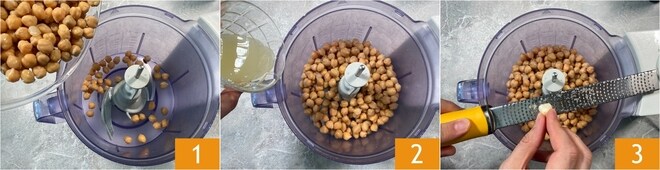 Para preparar el hummus sin tahina, coloca los garbanzos cocidos y escurridos en una batidora 1, luego añade el zumo de limón 2 y ralla un diente de ajo 3.