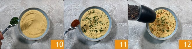 Transfiere la crema obtenida a un bol y decora con el perejil picado 10, el pimentón dulce 11 y una pizca de pimienta negra 12.
