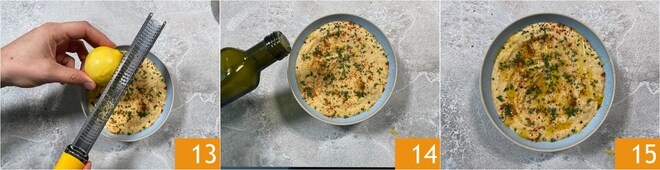 Aromatiza con la ralladura de limón 13 y completa con un chorrito de aceite 14. ¡Tu hummus sin tahina está listo para ser servido 15!