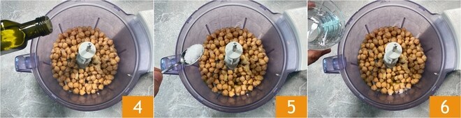Añade el aceite de oliva virgen extra 4, la sal 5 y el agua 6.