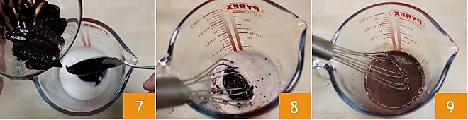 Pasado el tiempo necesario, sacad el chocolate de la nevera. En un recipiente verted los 200 ml de leche fría, añadid 200 gr de chocolate frío (guardad el resto para la decoración final) 7, mezclando para atemperarlo 8 hasta obtener una mezcla densa y homogénea y reservadla 9.