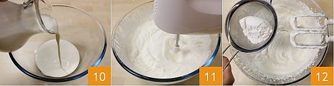 Pasad ahora a preparar la nata montada para la decoración (podéis consultar el procedimiento también aquí: cómo montar la nata). Verted la nata fresca líquida bien fría en un bol grande 10 y con las varillas frías de una batidora eléctrica, montad la nata a punto de nieve 11. Añadid en este punto el azúcar glas tamizado 12 e incorporadlo a la nata con una espátula mezclando de abajo hacia arriba para que no se desmonte y reservadla.