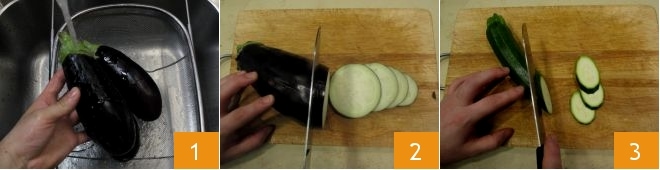 Para preparar la ensalada con scamorza y Verduras a la parrilla, lave todas las verduras bajo abundante agua fresca corriente 1 y séquelas. Corte los calabacines y las berenjenas en rodajas de un grosor de 4-5 mm (2-3);