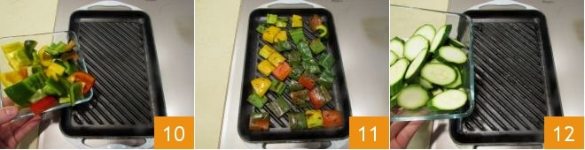 Cuando la parrilla esté bien caliente, cocine las verduras poco a poco: distribuya los trozos de pimientos uno al lado del otro 10, dejándolos asar durante 5 minutos y girándolos con unas pinzas de cocina para una cocción uniforme 11, luego coloque en el fuego los calabacines en rodajas 12