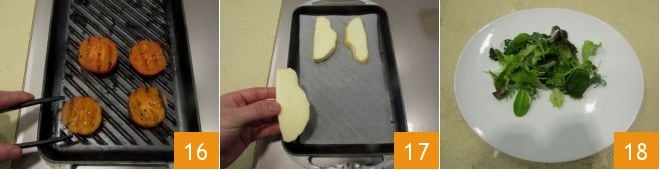 Finalmente, termine con los tomates, cocinándolos durante 4 minutos hasta que estén bien asados 16. Corte una hoja de papel de horno del tamaño de la parrilla y colóquela para proceder con la cocción de la scamorza. Distribuya las rebanadas y áselas durante unos segundos 17. En este punto, distribuya la ensalada mixta en un plato de servir 18 junto con las verduras;