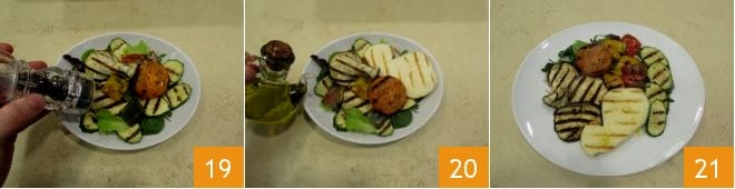 ajuste de sal y pimienta 19 y aliñe con el aceite de oliva. Finalmente, puede servir y disfrutar de su ensalada con scamorza y verduras a la parrilla 21.