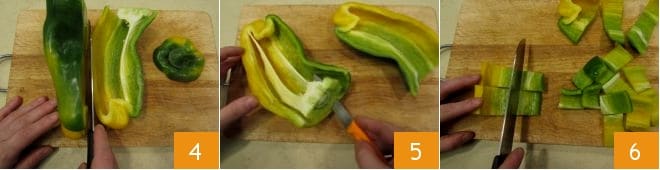 tome los pimientos, elimine la parte superior, divídalos por la mitad 4, después con un cuchillo quite los filamentos blancos y las semillas que se encuentran en el interior 5. Córtelos en rebanadas, luego en cubos bastante grandes y reserve 6.