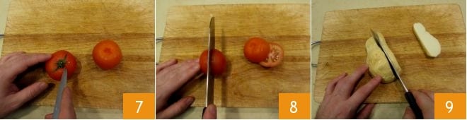 Quite el pedúnculo de los tomates 7 y córtelos en rodajas también de 4-5 mm 8. Corte la scamorza en rebanadas en sentido longitudinal 9, luego ponga a calentar una parrilla.